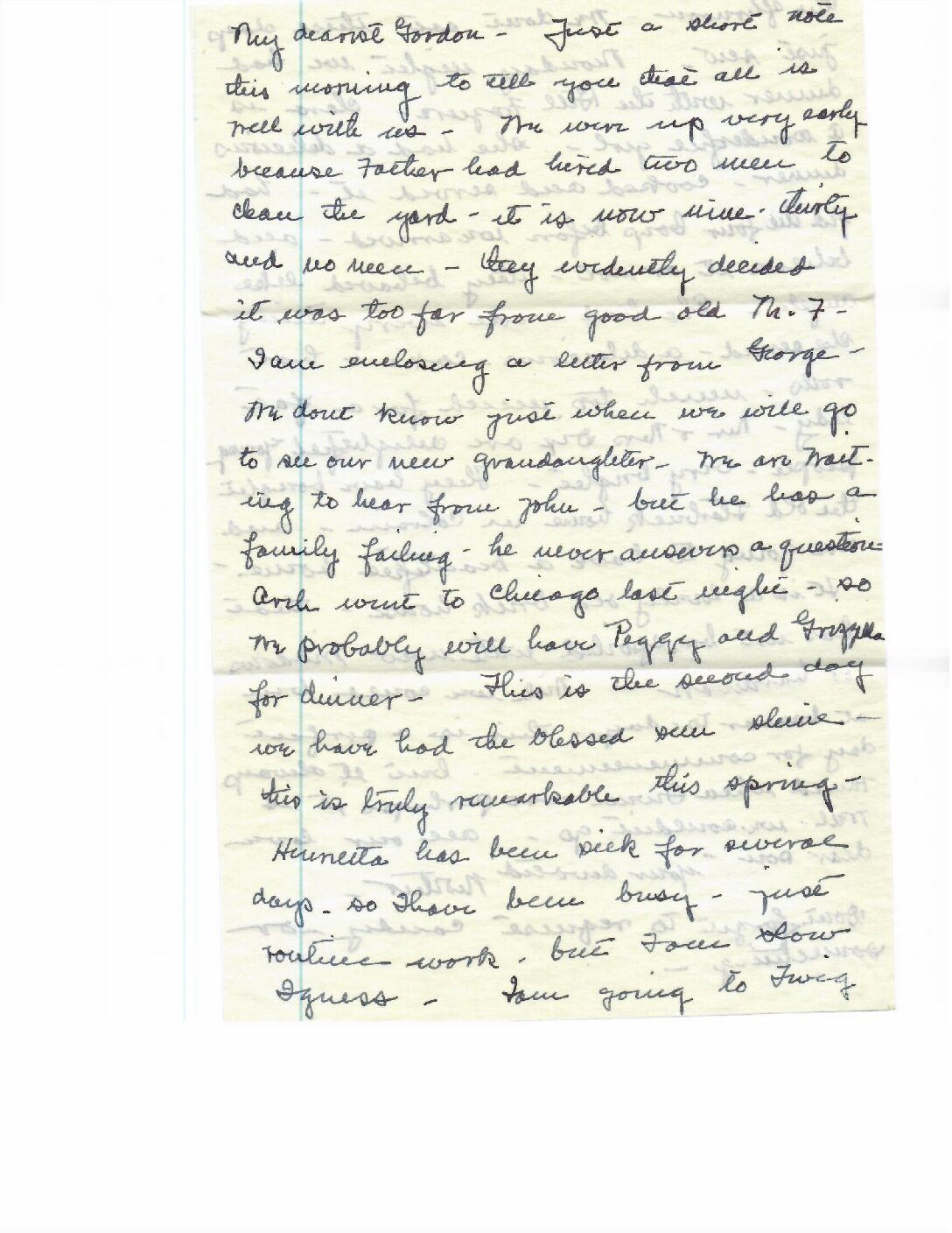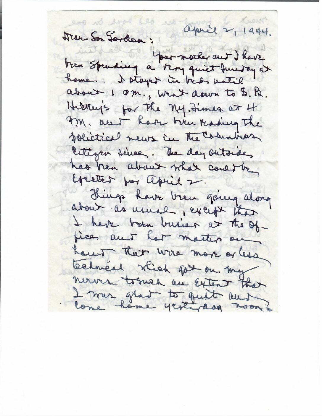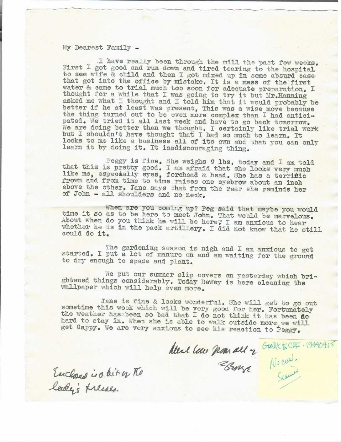 Typical GDK Sunday: in bed til 1 p.m. At 4, picks up NY Times & Columbus Citizen at S.B. Hickey’s in Bridgeport. Very busy at office. Technical matters got on his nerves, so left office at noon, Saturday. Handicapped by lack of good stenographer. Mattie now too old. Very excited about the new Peggy Kinder. Many calls from GeoDK. Looking for new dining room furniture.