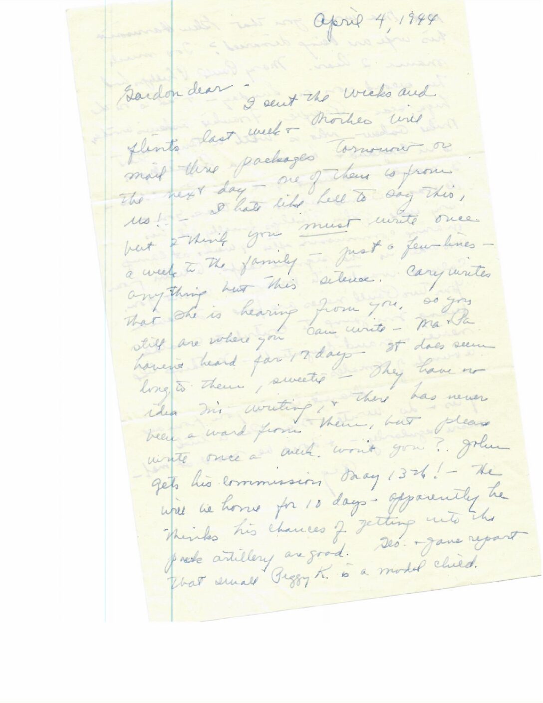 The letters begin in 1941 with Gordon’s graduation from university and his commissioning as an Army artillery officer and with Cary’s second year of college. They take the reader through their meeting in 1942; courtship against the backdrop of war; marriage in 1943; training for the invasion; six months in England; ten months of combat in France, Germany and Austria; and seven months in an Army of occupation.