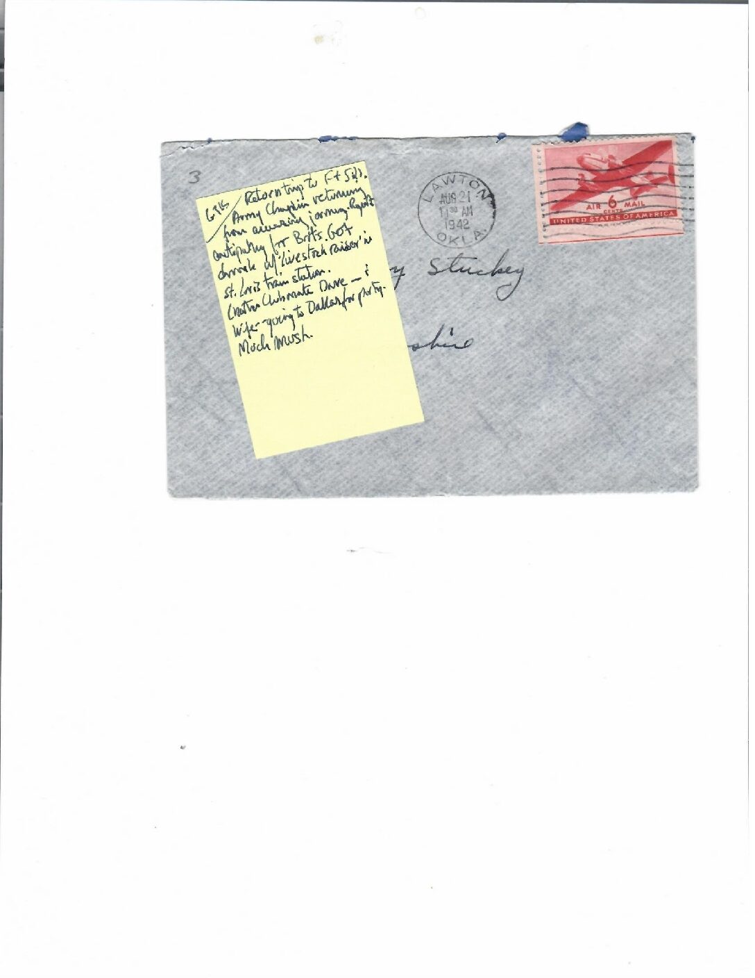 Return journey to Ft. Sill. Met army chaplain who’d served on a troop carrier that had made an amazing journey. He shared GTK’s antipathy for ‘Britishers’. Met a stockman in bar at St. Louis station. Had drinks with him and then a dinner with more drinks on train. Talked with sargent from Wisconsin who gave GTK some excellent, home-made cheese. Saw a Princeton Charter Club member in his class, Dave ___. May go to Dallas with him. Much mush.