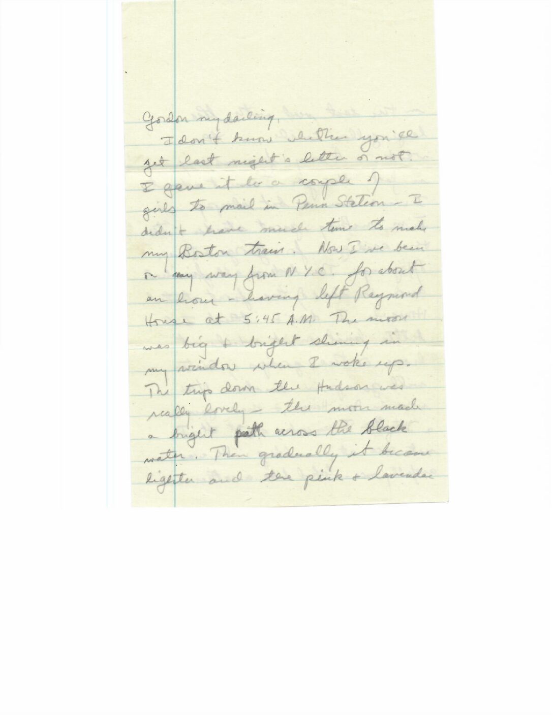 On train on way to Exeter. Left Vassar at 545 a.m. Beautiful ride down the Hudson. Making progress on cardigan for Jane C. Kinder’s baby. Admiring white N.E. houses, hoping she and GTK will live in one with lots of children. Wants to live in a society where money isn’t all important.