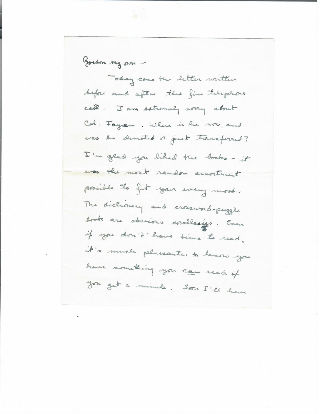[Lt. Col. Burtis L.] Fayram left the battalion CSK sorry about it. Sent books to GTK. She finished reading ‘Ulysses’, which she liked, and wrote a paper on it. Hopes for time to really study it. Now reading ‘The Forsyte Saga’ which she is loving. Wants to know what art books he has, as the Vassar Bookstore’s supply is dwindling. Copies Elizabeth Barret Browning’s ‘How do I love thee?’ in the letter. Encloses three Dahl cartoons from the Boston Herald. Dahl was a favorite of hers and her family. Stories on the back of the cartoons give a real sense of the war on the homefront.